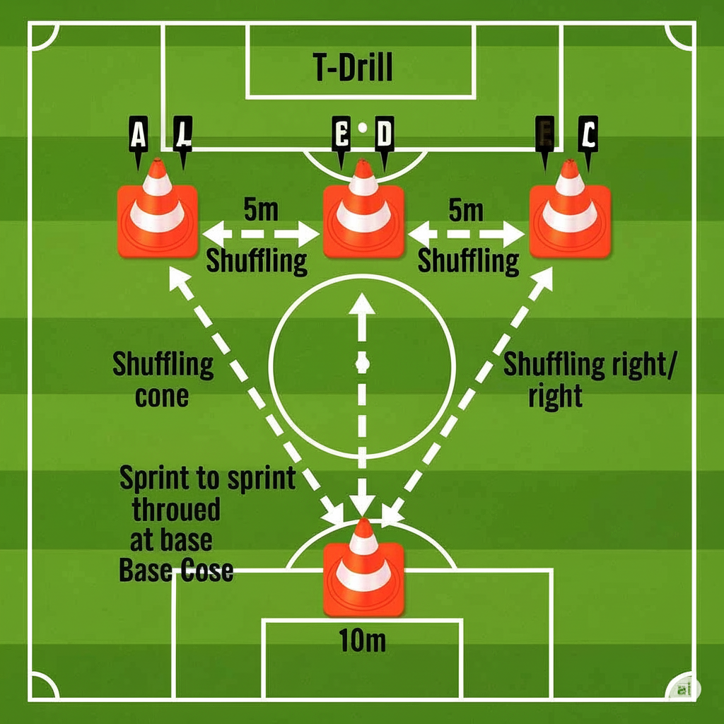 - ضع الأقماع لترسم حرف T (نقطة A في الأسفل، نقطة B أمامها، ونقطتان C وD على جانبي B).